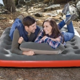 This double inflatable mattress combines robust, damage-resistant PVC with a pleasant velvet-like (flocked) surface for higher comfort and better sheet grip. The integrated 2-in-1 pillow and stable coil‑beam construction provide even body support throughout the night.