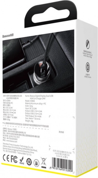 Compact car charger Baseus with display offers fast charging for two devices simultaneously thanks to 4.8 A output and high-quality aluminum design.