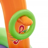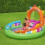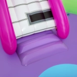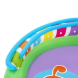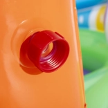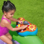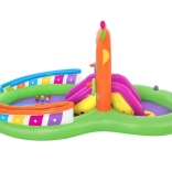Explore and enjoy lots of fun features with the Sing and Splash inflatable water play center. The play center includes a microphone and a drum for kids to play with and spark their imagination. The dual pools are connected by a removable slide secured with ropes and loops. An inflatable cushion built into the floor ensures a soft landing from the slide. Connect the arch with a built-in sprinkler to a garden hose. Toss the inflatable rings onto the pegs on the arch. The set includes 6 colorful balls that you can send down either ramp. These activities are not only fun, they also develop hand-eye coordination.