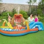 The Bestway Volcano inflatable water playground turns your garden into a hub of summer fun. Kids will enjoy sliding down the soft inflatable slide, splashing under the water sprayer, and playing with balls and tossing features. Thanks to the shallow paddling pool, the play center is suitable for the youngest children, while the durable PVC and drain valve make use and maintenance easy.