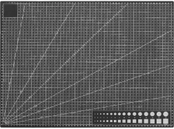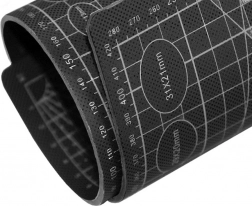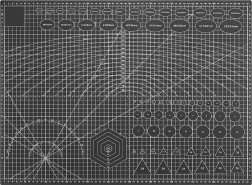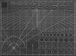 The mat features printed measuring elements such as metric scales, protractors, and geometric patterns.