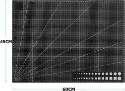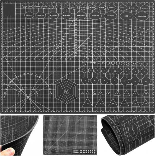 The mat's surface features a printed centimeter scale, protractors, and geometric shapes, facilitating precise measurements. We recommend storing it flat and avoiding exposure to direct sunlight.