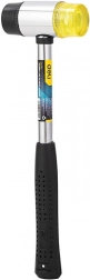 This hammer has a yellow and black rubber head for universal use without damaging surfaces.