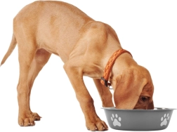 The bowl is adorned with paw prints, adding style and appeal.