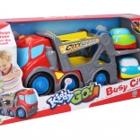 A fun set for little drivers: the Kiddy tow truck measuring 31 cm and two small cars 9 cm. It offers light and sound effects, free-rolling wheels for smooth driving, and a tilting ramp with two platforms for easy loading. Suitable for children from 18 months, 2× AA batteries included.