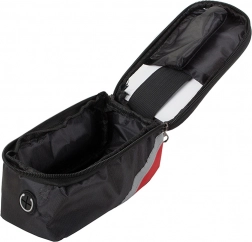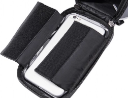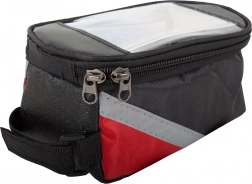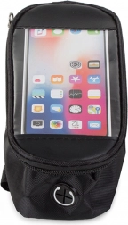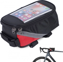 Practical frame bike bag with a transparent compartment for phones up to 6.8". It offers waterproof construction, quick hook-and-loop attachment, a touch-responsive film, and reflective elements for increased safety. The spacious compartment holds keys, a wallet, and small tools—everything within reach while riding.