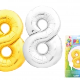 Stylish foil balloon in the shape of number 8 with a diameter of 40 cm, ideal for birthdays, anniversaries, and themed parties. Available in elegant gold and silver colors, made from durable nylon for longer lifespan and a beautiful shine.
