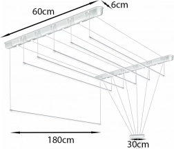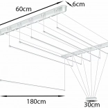 The rack mounts to the ceiling, so it doesn't take up floor space. Dimensions 180 × 60 × 30 cm provide a generous drying area even in a small bathroom or on a balcony.
