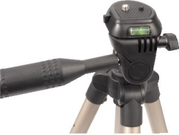 A lightweight and compact tripod for amateur use with a maximum height of 106.5 cm. It offers four-section legs with clamps, rubber feet for stability, and a 3-way head with quick-release plate for easy camera mounting. A practical carrying bag is included.