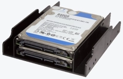 A universal plastic bracket that securely installs a 2.5" HDD/SSD into a 3.5" bay in your computer. It fits up to two drives, is shock-resistant, and easy to mount.