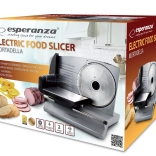 The Esperanza Mortadella Electric Slicer is equipped with chrome and nickel-plated metal, providing it with long lifespan and easy maintenance. The large stainless steel blade with a 19 cm diameter easily cuts food into even slices.