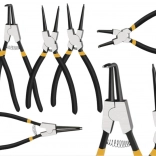 Universal set of four circlip (seeger) pliers for internal and external use. Combines straight and bent jaws, a robust body made of chrome‑vanadium steel, and ergonomic handles for a secure grip. Ideal for precise installation and removal of rings in mechanics, electronics, and hydraulics.