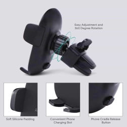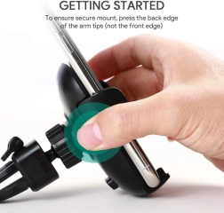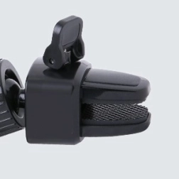 The widely adjustable clamp with a quick-release button allows lightning-fast insertion and removal of the phone. The contact surfaces are lined with soft silicone that dampens vibrations, prevents slipping, and protects against scratches. The mounting mechanism is compatible with most standard vents—it handles both horizontal and vertical slats and thinner or thicker grilles.