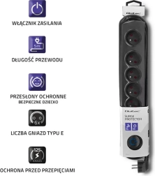 A practical surge-protected power strip with 6 outlets and a 5 m cable for safe and convenient powering of multiple devices. It offers a backlit foot switch Quick Switch, surge protection, child safety shutters, and flame-retardant material for maximum safety at home, in the office, or in the workshop.