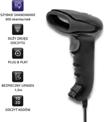 The Qoltec barcode scanner is designed for maximum efficiency and reliability. It allows scanning of 1D and 2D codes with a speed of 300 scans per second and a working distance of up to 100 m from the receiver. This device is resistant to falls from a height of 1.5 m and allows scanning of codes at various angles, including inverted ones.