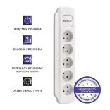 This power splitter allows you to connect multiple devices to one power source, ideal for organizing cables under a desk, behind a TV, or in a kitchen. With its elegant design in classic white, it adapts to any interior. The device features a backlit switch for quick and easy control of connected devices. The switch can be used as a foot switch, which is very practical.