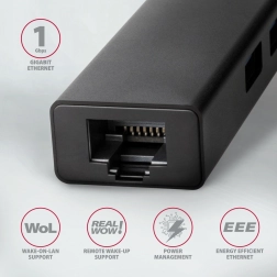The elegant and durable AXAGON HMC-GL3A multiport hub is a great companion for ultrabooks and modern USB-C laptops. You get three fast USB-A ports for peripherals and external drives plus a stable Gigabit LAN for work and entertainment. Thanks to USB 3.2 Gen 1 (USB 3.0), it handles transfers up to 5 Gb/s and easily serves multiple external drives at once.