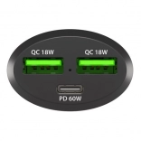 NATEC Coney is an elegant and durable car charger for 12/24 V sockets that can power a phone, tablet, and a smaller laptop at the same time. With a total output of 84 W and three ports—USB‑C PD 3.0 (60 W) and 2× USB‑A QC 3.0—you get reliable, fast charging on every trip.
