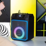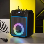 The control panel features separate bass and treble adjustments and an equalizer with Normal, Rock, Pop, Classic, Jazz, and News modes. The TWS (True Wireless Stereo) function lets you link two MB06.2 units for a wider soundstage and a genuine stereo effect. Karaoke with the included wired microphone will light up any party, while the LED lights create an impressive club-like vibe.
