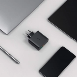 The compact AUKEY PA-D3 wall charger with dual ports (USB-C + USB-A) delivers up to 60 W for fast and safe charging. Thanks to Dynamic Detect technology, it uses full power when charging a single device, and intelligently splits power when charging two devices at once. Ideal for smartphones, tablets, and laptops, with a foldable plug for easy travel.