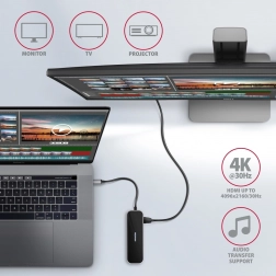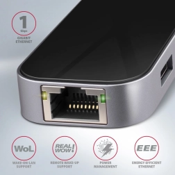 A dedicated USB-C connector allows for powering a laptop or smartphone with Power Delivery 3.0 technology up to 60W. Connect a USB-C Power Delivery charger to the hub and save one device. However, a compatible laptop and charger supporting Power Delivery are required.