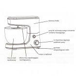 Additional features include automatic stop when the head is lifted, mixer lock, and sturdy rubber feet for stability. Safety lock and overheating protection ensure the device's long lifespan. The cable is 105 cm, the device measures 13.5 cm in width, 28 cm in height, and 28.5 cm in length, with a weight of 5.25 kg.