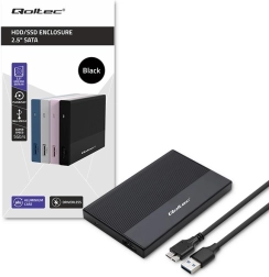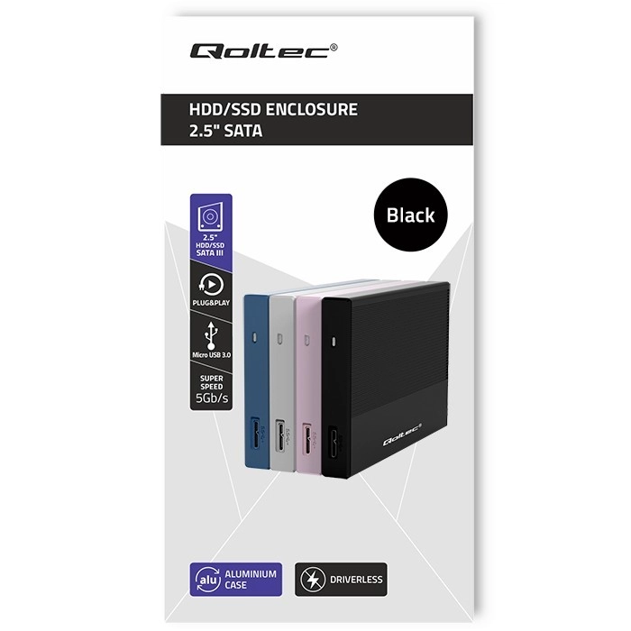 A compact and elegant aluminum external 2.5" enclosure for both SSD and HDD offers a fast USB 3.0 interface with reliable transfer speeds up to 5 Gb/s, compatibility with SATA3, and a maximum drive capacity of 2 TB. Thanks to Plug&Play, it works without driver installation and is compatible with Windows, macOS, and Linux.