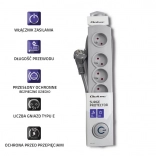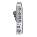 A practical surge-protected extension power strip with 5 outlets, a 1.8 m cable, and an illuminated foot switch for quick on/off control. Elegant gray design, option for furniture mounting, and wrap-around storage for excess cable. Safety features include surge protection, child safety shutters, and flame-retardant material.