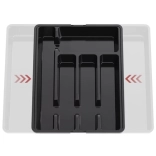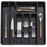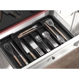 A practical black drawer organizer with an expandable mechanism that easily adapts to your drawer width and keeps all cutlery and kitchen tools in place. Made of durable PP, it has a smooth surface for easy cleaning and offers up to 7 well-organized compartments. Ideal for universal use, quick organization, and a modern look in any kitchen.