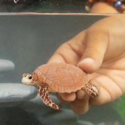 The thick shell of the crested turtle has a reddish-brown color that stands out against the dark blue of the ocean. The front and rear legs of this black-eyed reptile also feature brown and yellow patterns. It looks truly magnificent as it swims amid the sea foam. Maybe it will let us observe it up close if we offer it a treat?