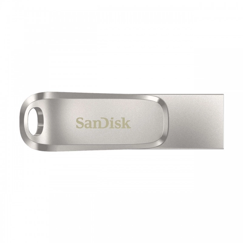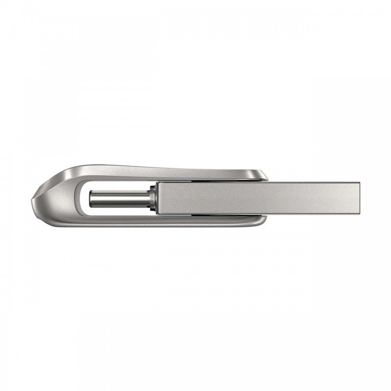 The compact metal flash drive SanDisk Ultra Dual Drive Luxe 512 GB with dual USB‑C and USB‑A interfaces makes it easy to transfer files between your phone, tablet, Mac, and PC. It offers fast read speeds up to 150 MB/s, a rotating metal body to protect the connectors, a handy keyring loop, and support for the SanDisk Memory Zone app for simple backups.