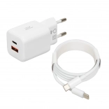 With its two ports, USB-C and USB-A, it allows fast and safe charging of multiple devices at once. The included USB-C to USB-C cable makes connecting easy.
