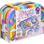 A magical tea set in a cute suitcase with a unicorn motif will delight every little host. Includes a teapot, 4 cups, 4 saucers, and 4 plates, all made of durable metal. The practical suitcase with handle measures 25 × 19 × 10 cm – ideal for travel and storage.