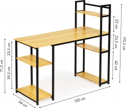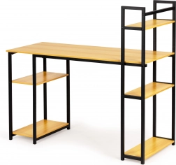 The writing desk combines modern design with practical elements. The large work surface provides ample space for work, while the durable laminated finish ensures longevity and a luxurious appearance. There are six shelves on the side of the desk for efficient workspace organization.
