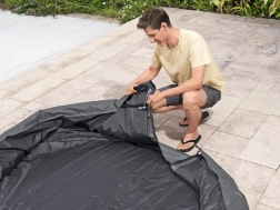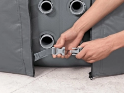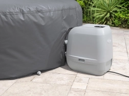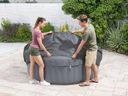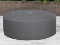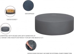 Installation is quick and intuitive. The adjustable perimeter strap with safety clips ensures a secure fit, while the integrated zipper enables seamless connection to the pump without having to remove the cover. The cover is compatible with Lay-Z-Spa St. Moritz, Monaco, Santorini HydroJet Pro and other round hot tubs with a 216 cm diameter.