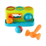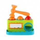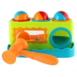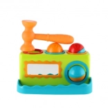This colorful 21 cm plastic hammering bench is a great choice for first developmental play. Children safely hammer three balls into the prepared holes, training grip, strength, and accuracy. The integrated mirror on the front increases interaction and fun.