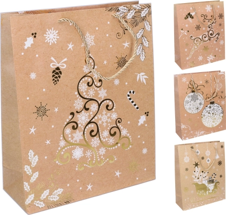 A stylish Christmas gift bag in size S measuring 18 × 23 × 10 cm, ideal for small and medium gifts. It offers 4 different designs, quality workmanship, and a sturdy handle for comfortable carrying.