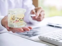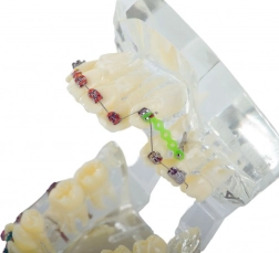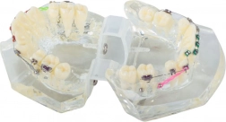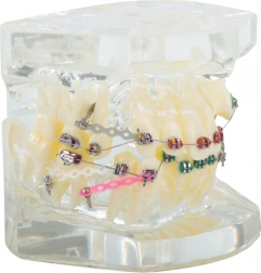 The model realistically depicts human teeth and orthodontic braces, ideal for demonstration.