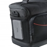The interior can be customized with an adjustable divider, so you can easily organize your camera, batteries, charger, and memory cards. The practical front zip pocket and side meshes ensure quick access to small items. The durable EVA bottom keeps the bag stable and protects the contents even on damp or uneven surfaces.