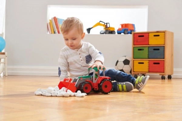 Discover the durable LENA TRUXX tractor that boosts imagination and fine motor skills. With the front loader, kids can easily scoop and pour sand or blocks and enjoy hours of creative play. The opening cab with driver figure adds realistic details and supports role-play scenarios on the farm and at the construction site.