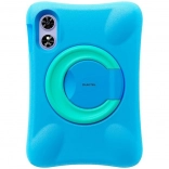 The stand and handle ensure the tablet is easily grasped and stable. The case protects the device from impacts and is made of plastic in bright blue and turquoise colors. The brand 'OUKITEL' logo is visible on the handle.