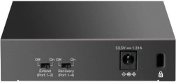 PoE+ functionality allows device powering such as IP cameras and access points using a single cable with a PoE budget of 65 W. In Extend mode, PoE transmission can reach up to 250 m, making camera distribution easier in extensive areas.