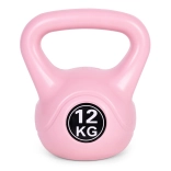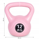 Universal pink kettlebell weighing 12 kg for strength, stability, and conditioning. Features an ergonomic handle, a flat base for stability, and a durable construction with a plastic shell and cement core – ideal for beginners and advanced users and for functional training and rehabilitation.