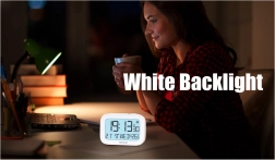 The clock is equipped with a large, easy-to-read LCD display that shows the time, date, and temperature.