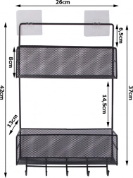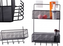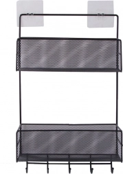 Bring order to your bathroom, kitchen, or hallway with this stylish metal organizer. It offers 2 spacious shelves, bottom hanging hooks, and easy drill-free installation using adhesive mounts. The durable metal mesh ensures ventilation and moisture drainage, while the black finish suits any interior.
