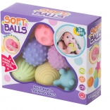 The set includes six balls with various structures: small and large bumps, indentations, grooves, and hedgehog-like spikes. It teaches coordination, color and shape recognition, and provides a relaxing massage that soothes and prepares the child for sleep.