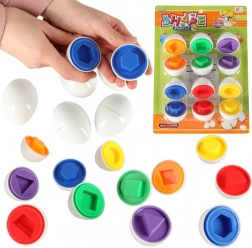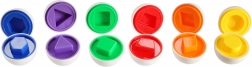 Colorful eggs help children develop eye-hand coordination by matching egg halves with shapes and colors.