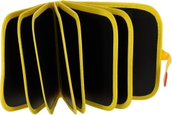 The book opens like a case and stays securely closed with a hook-and-loop fastener. Lightweight and compact—perfect for travel and on-the-go fun.
