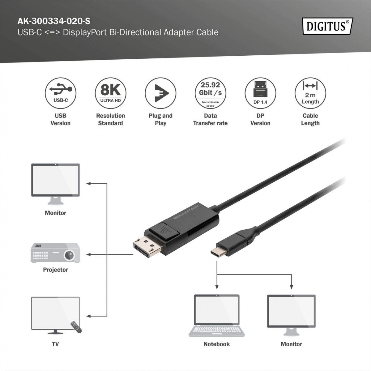 USB Type C - Bidirectional DisplayPort Cable Adapter from Digitus supports transmission both from USB Type C to DisplayPort and vice versa. With this cable, you can, for example, connect a laptop with a USB-C port to a monitor with a DisplayPort interface or a desktop with a DisplayPort output to a monitor with a USB-C port. This adapter is also fully powered via USB, eliminating the need for external power.