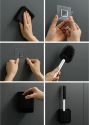 The included self-adhesive holder allows wall mounting without tools. Alternatively, the brush can be used free-standing.